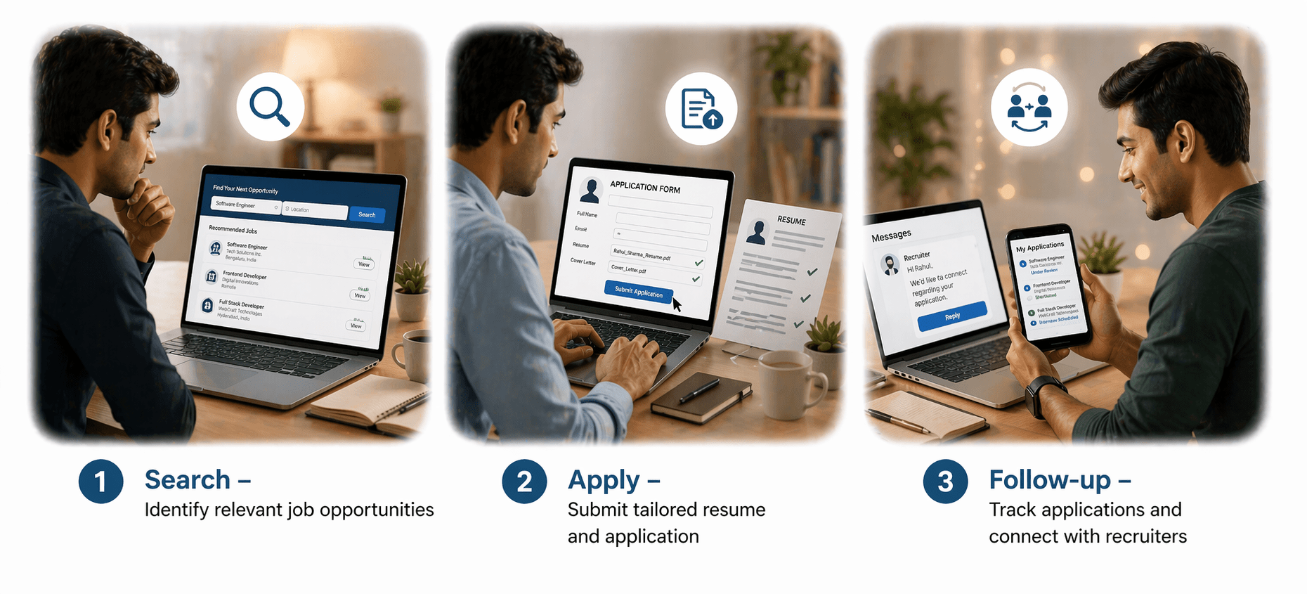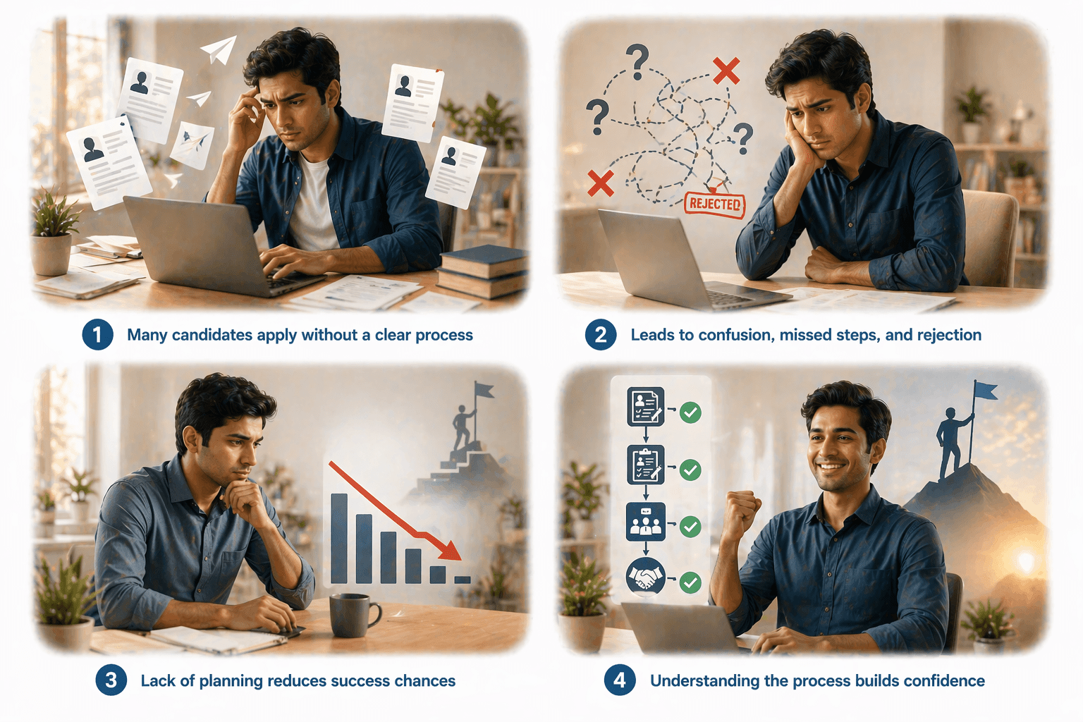 The job application process is a step-by-step journey a candidate follows to secure a job from searching opportunities to getting a response from employers.