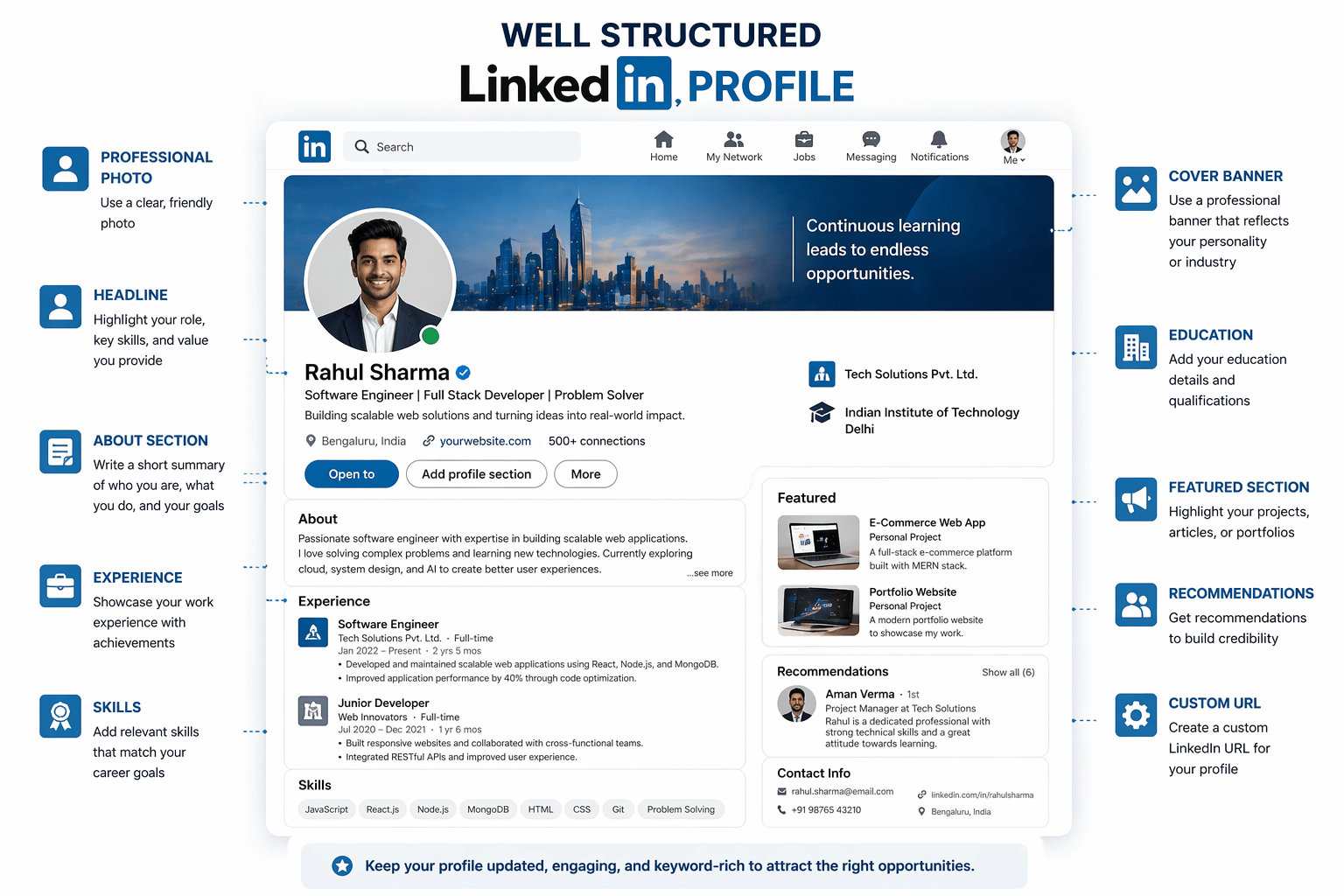 3.Build & optimize online profiles – complete sections, add skills, projects