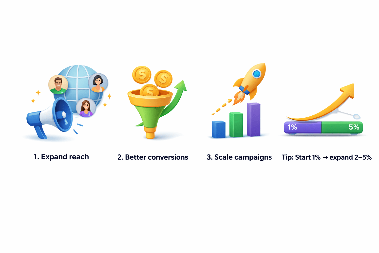 Start 1% → expand 2–5%