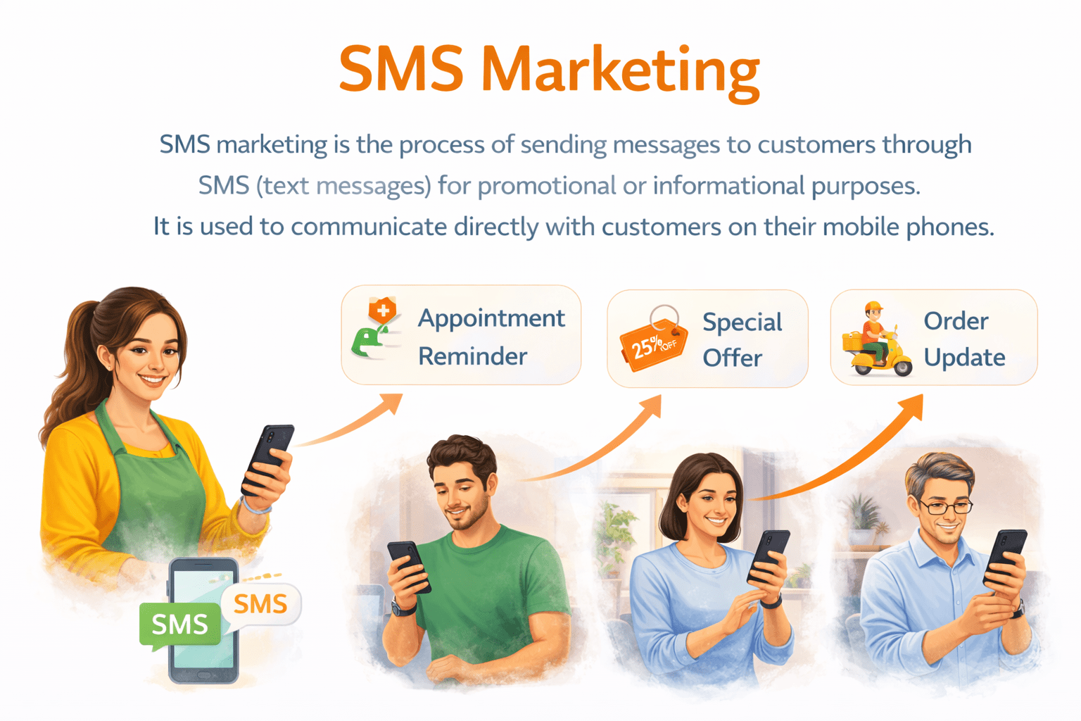 SMS marketing is the process of sending messages to customers through SMS (text messages) for promotional or informational purposes.