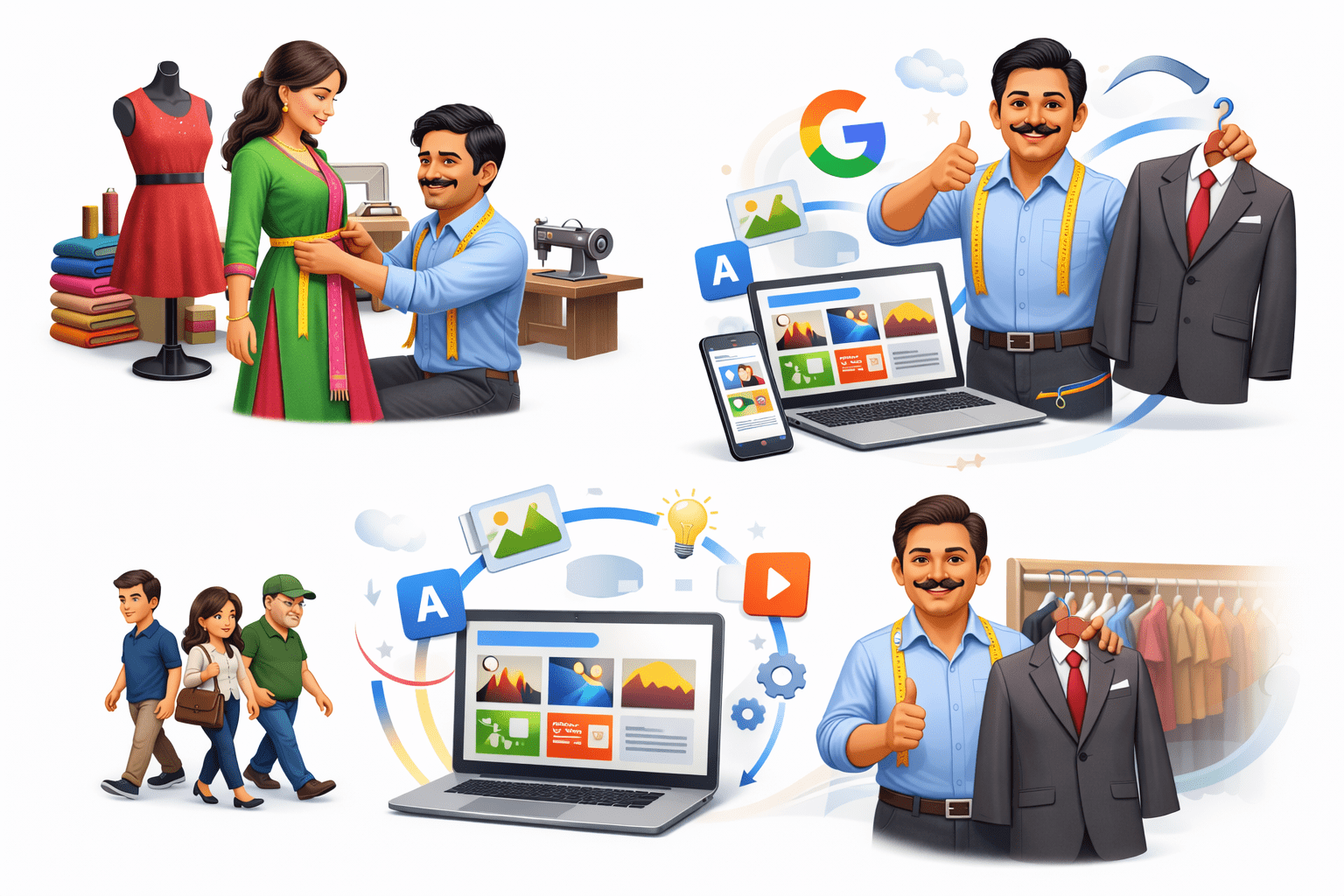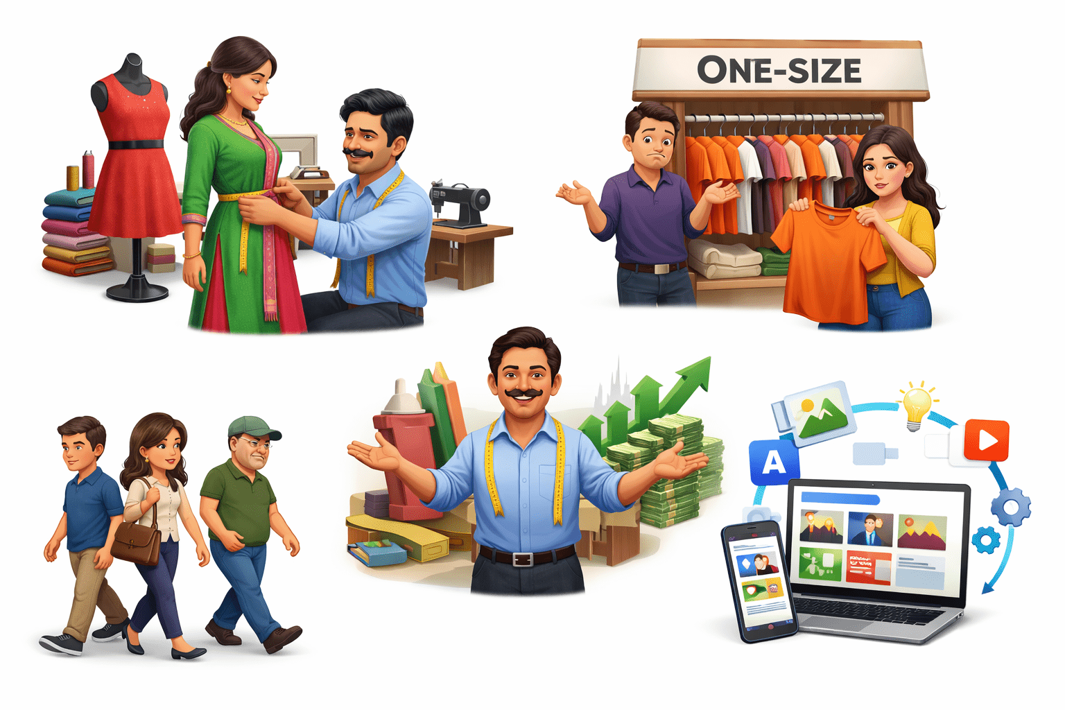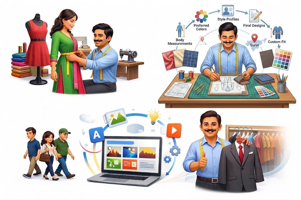 Hasmukh, a tailor in Surat, created custom-fit outfits based on each customer’s measurements, preferred colors, and style.