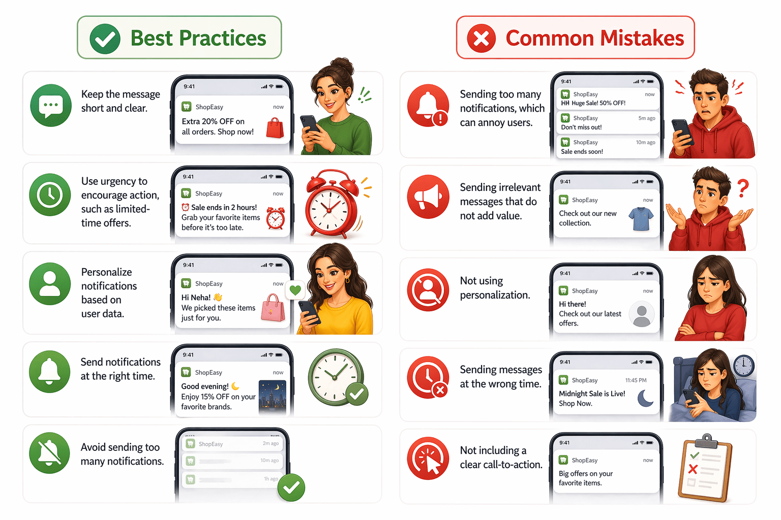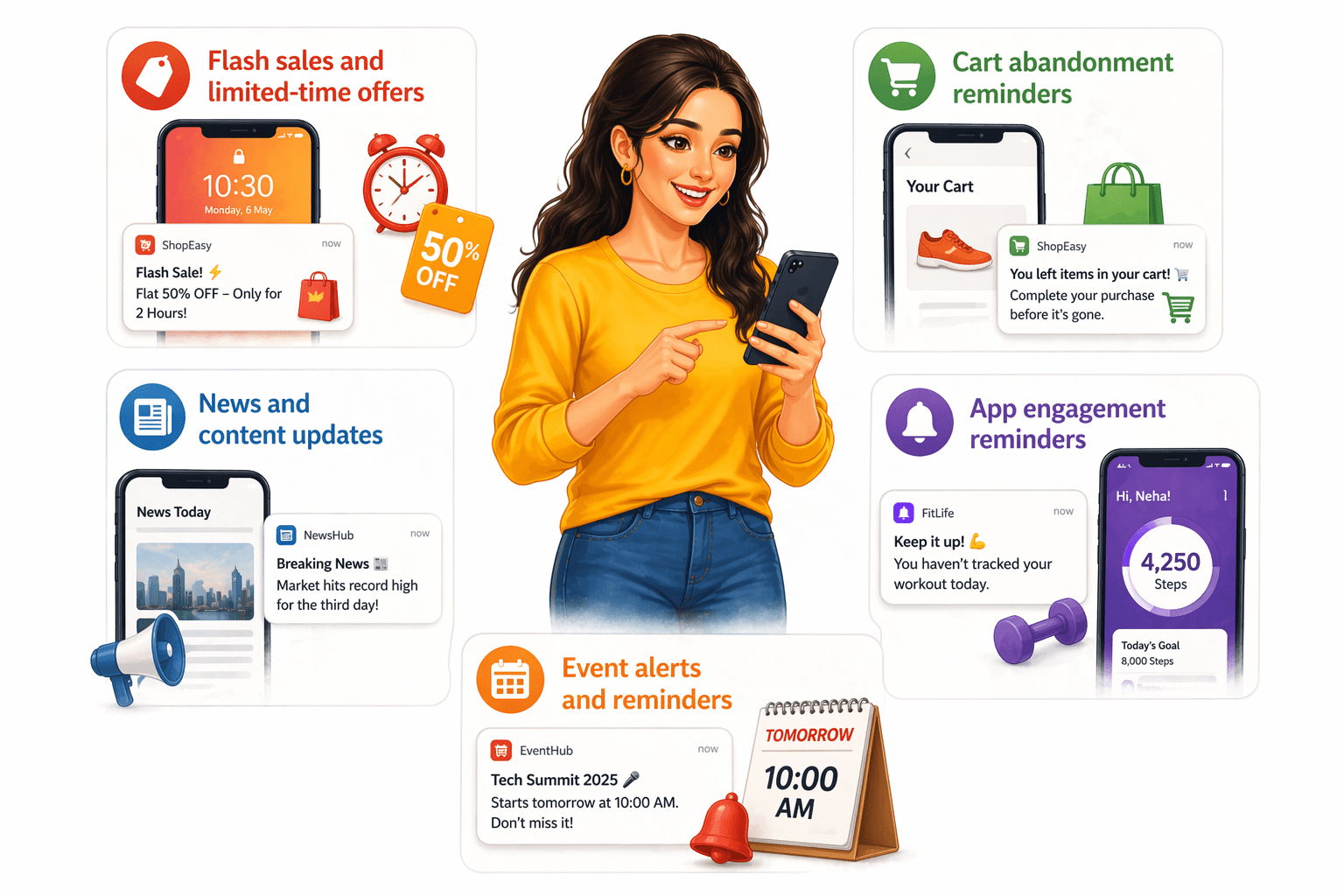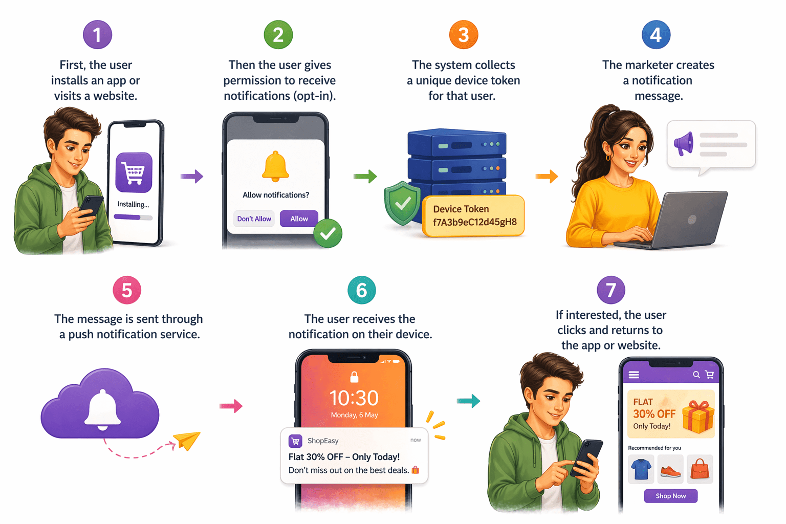 Instead of waiting for users to return, brands reach out directly with timely messages—offers, reminders, and urgency.