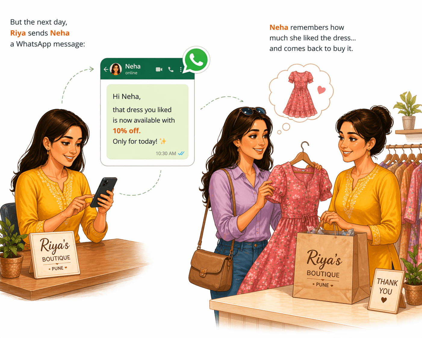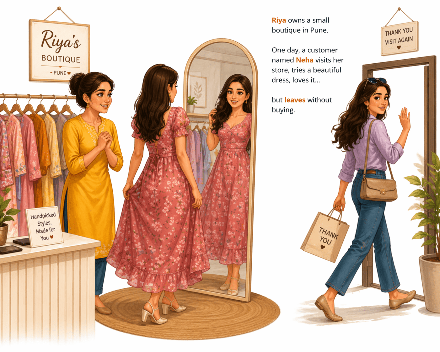 One day, a customer named Neha visits her store, tries a beautiful dress, loves it…
