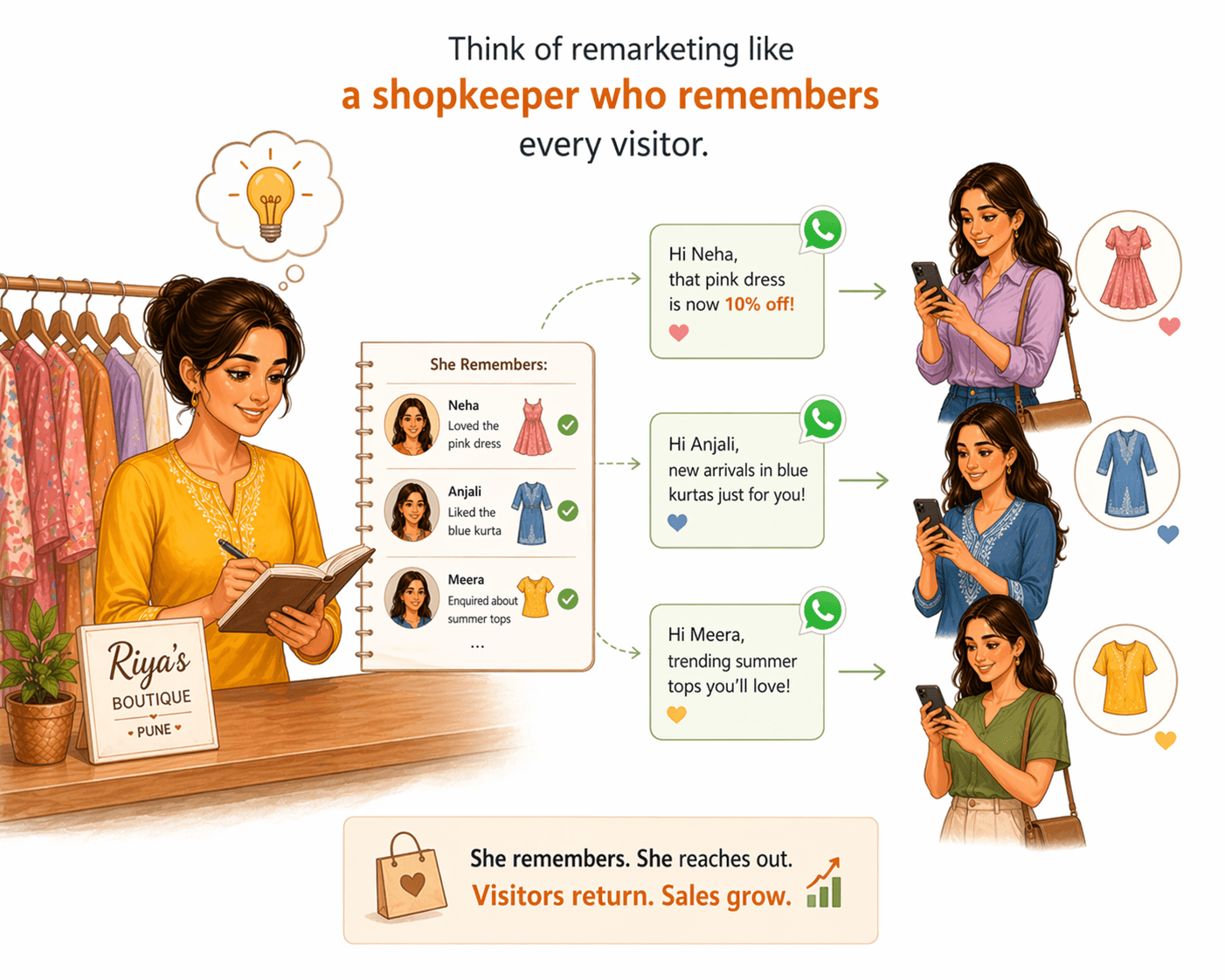 Think of remarketing like a shopkeeper who remembers every visitor.