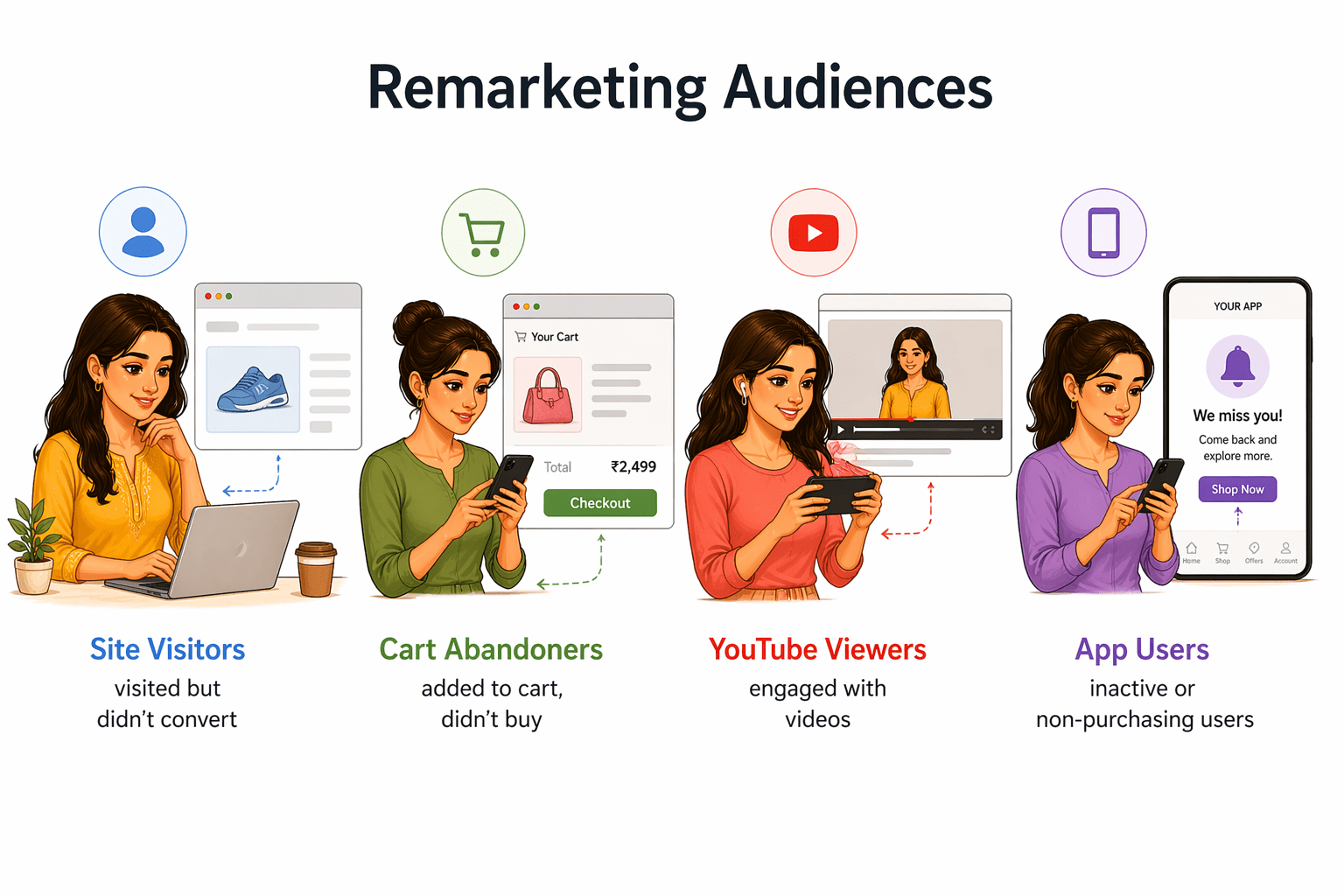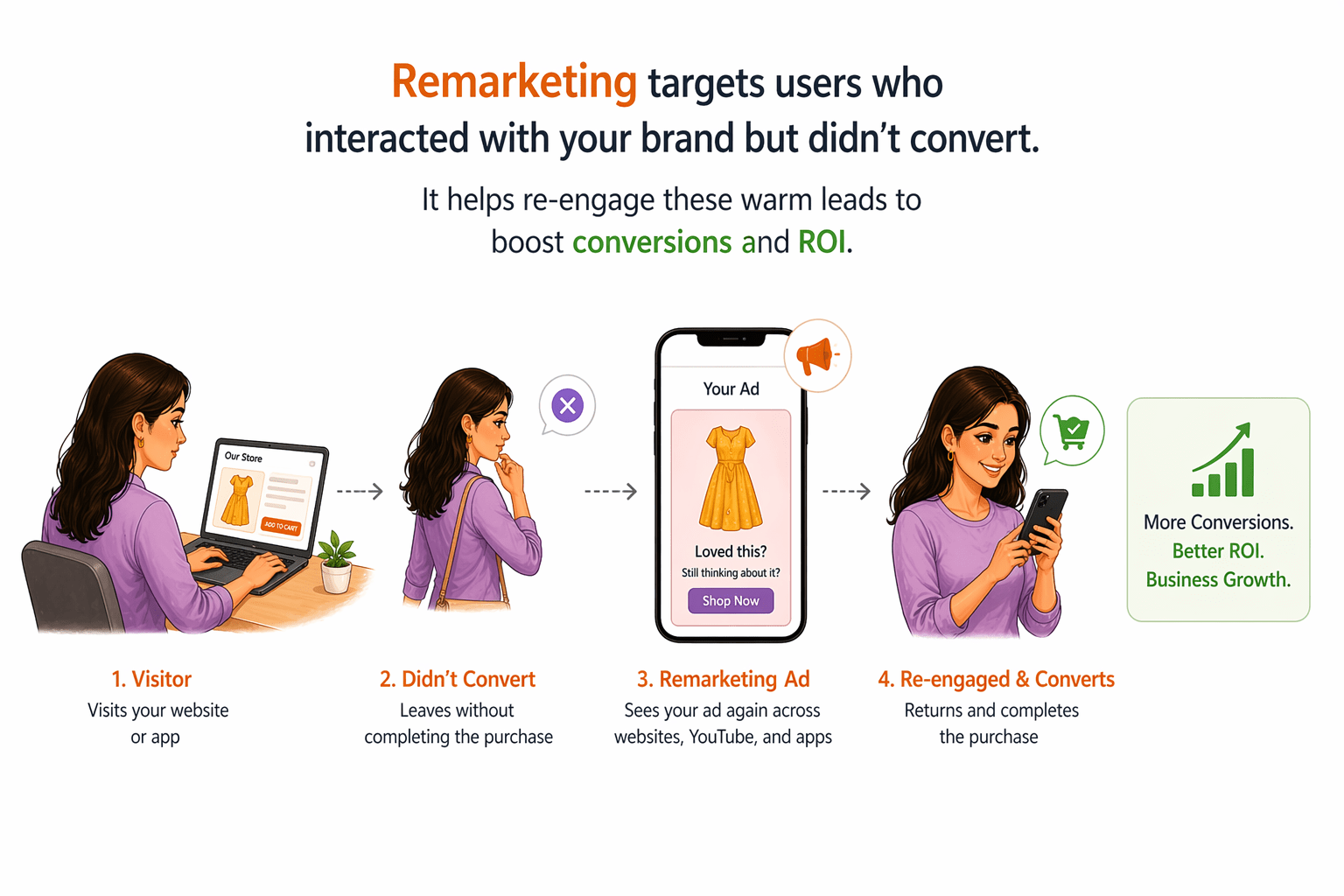 Remarketing targets users who interacted with your brand but didn’t convert. It helps re-engage these warm leads to boost conversions and ROI.