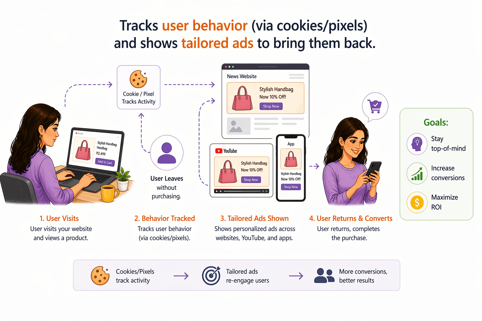 Tracks user behavior (via cookies/pixels) and shows tailored ads to bring them back.