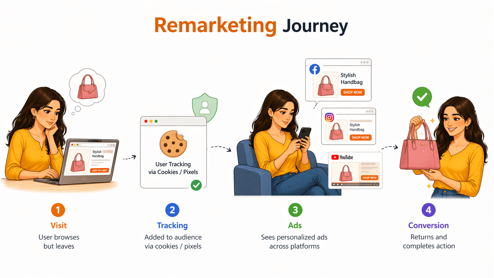 It tracks visitors and shows them ads again across websites, YouTube, and apps.