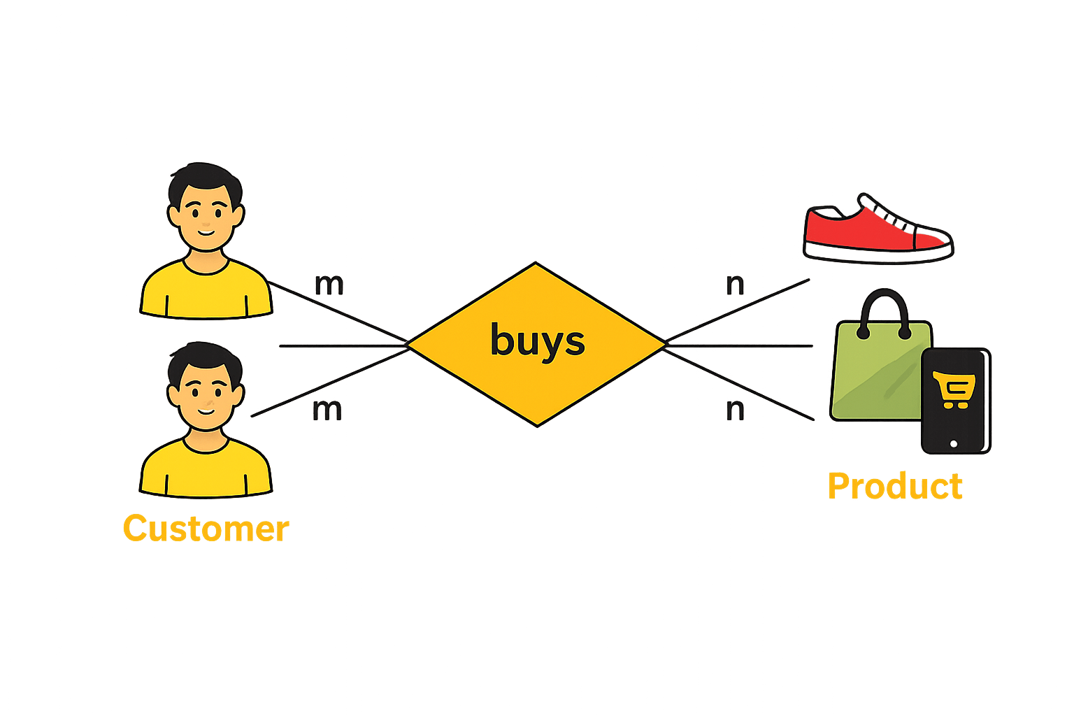 For example, If there are two entity type ‘Customer’ and ‘Product’ then each customer can buy more than one product and a product can be bought by many different customers.