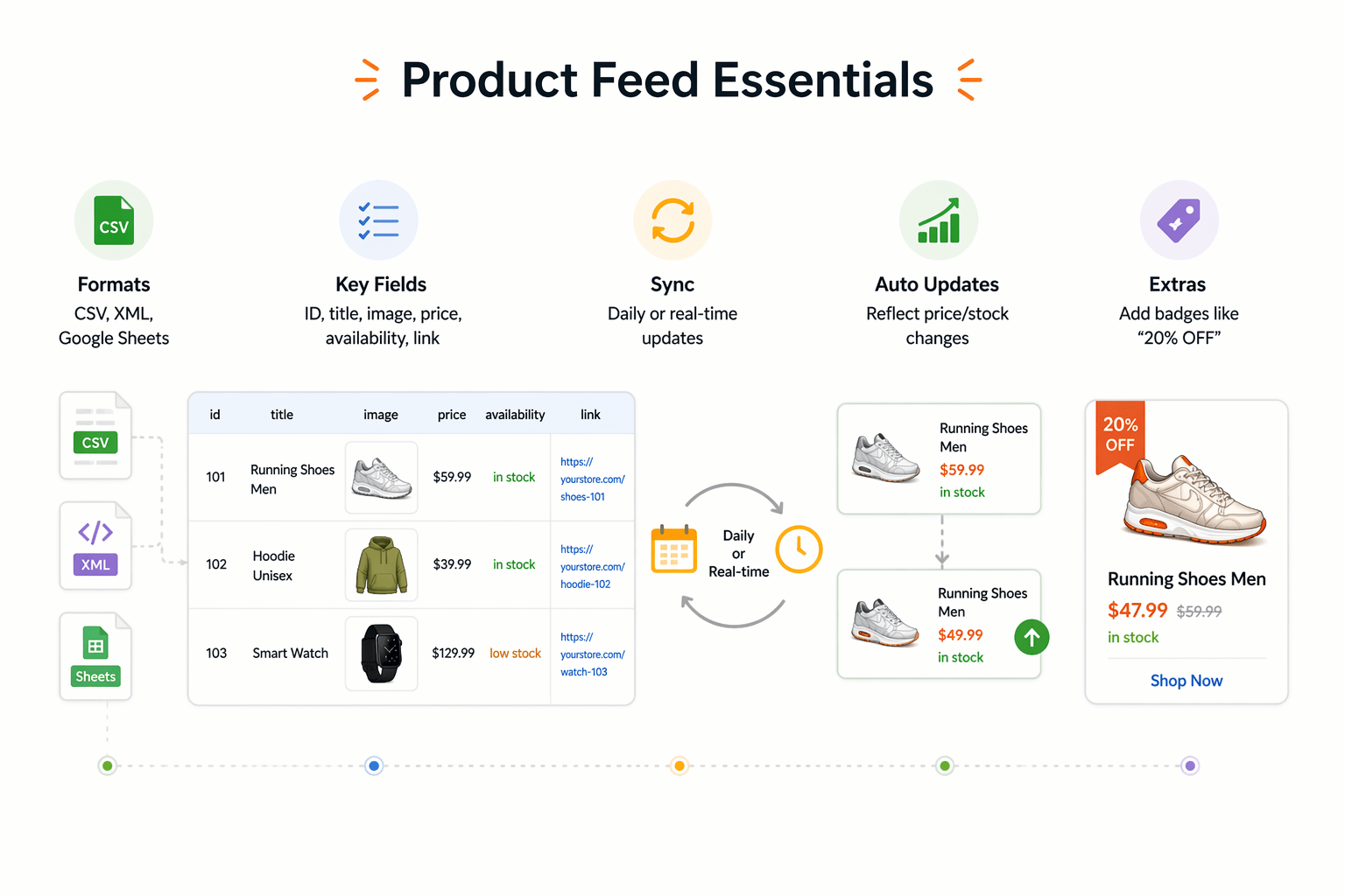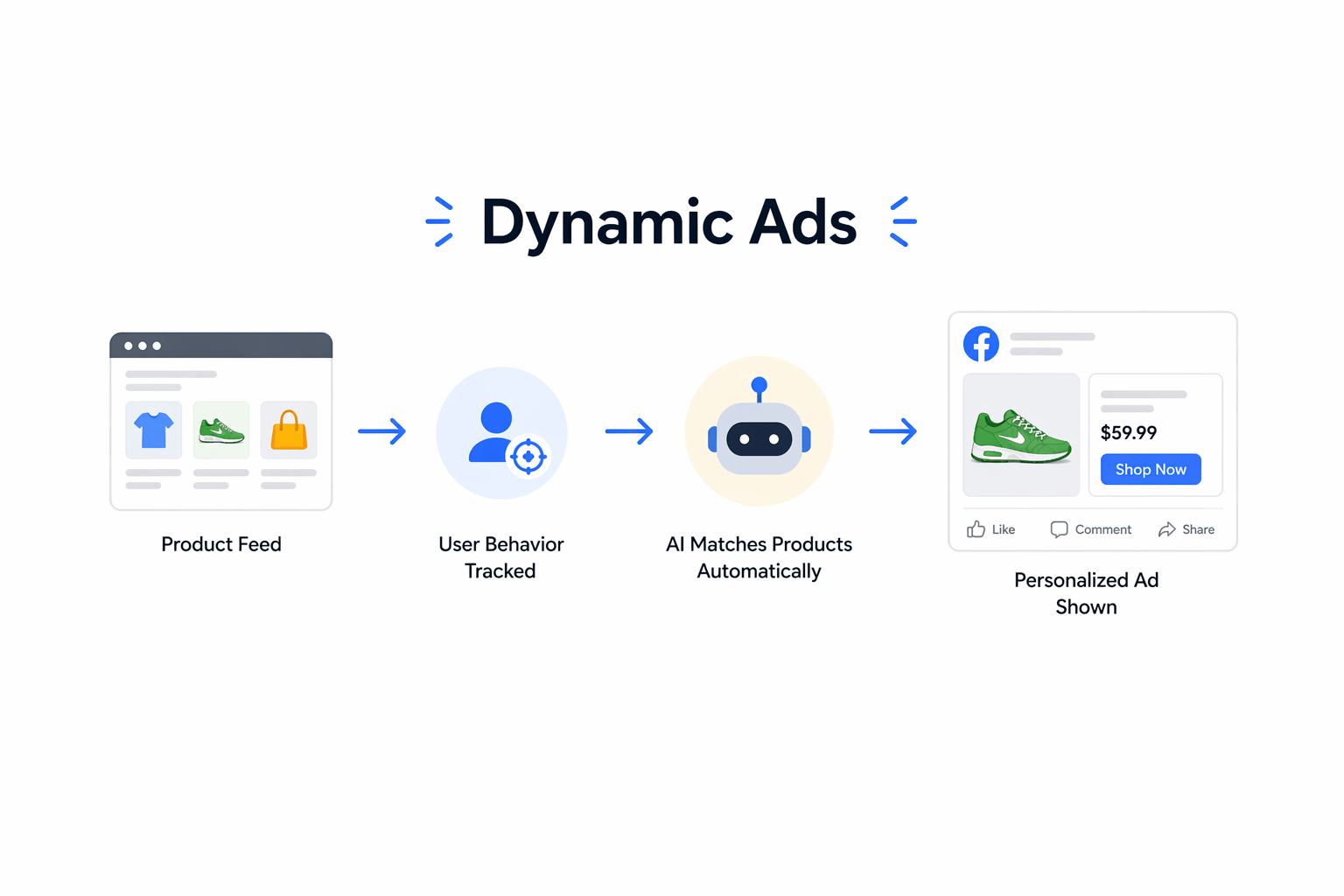 Dynamic ads automatically show personalized products (titles, images, prices) based on user behavior. Ideal for e-commerce, they promote large inventories without creating separate ads.