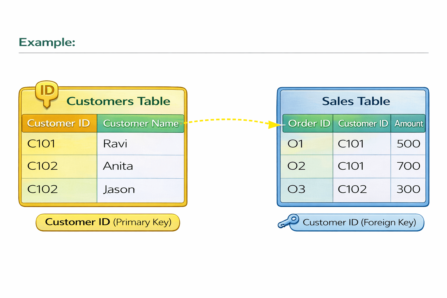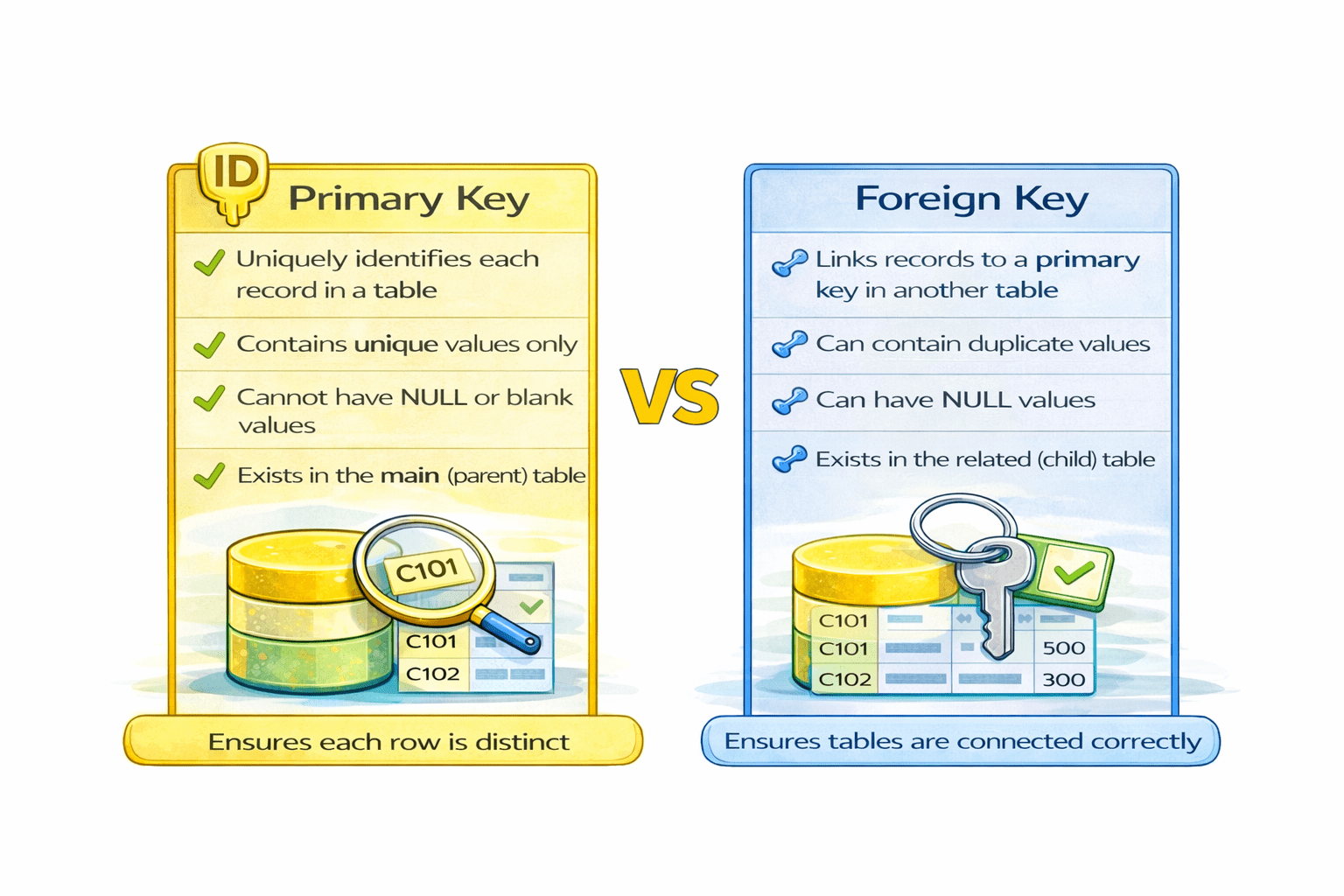 A Foreign Key is a column that connects one table to another by referencing a primary key, allowing repeated values and ensuring related data stays consistent.