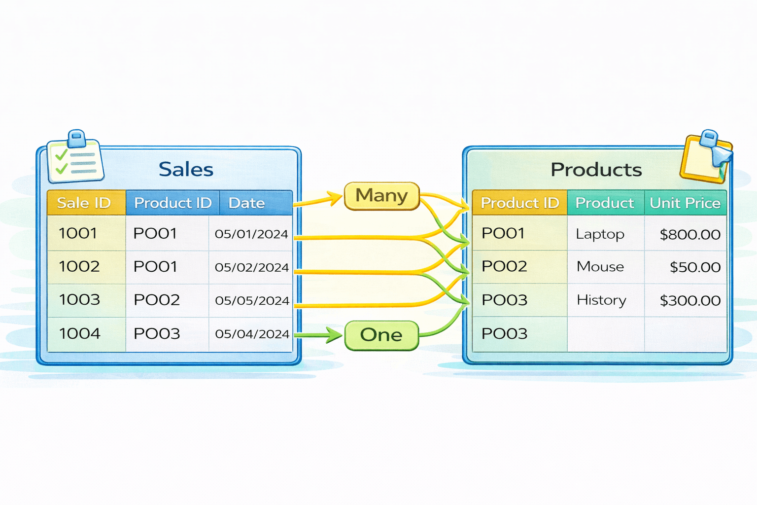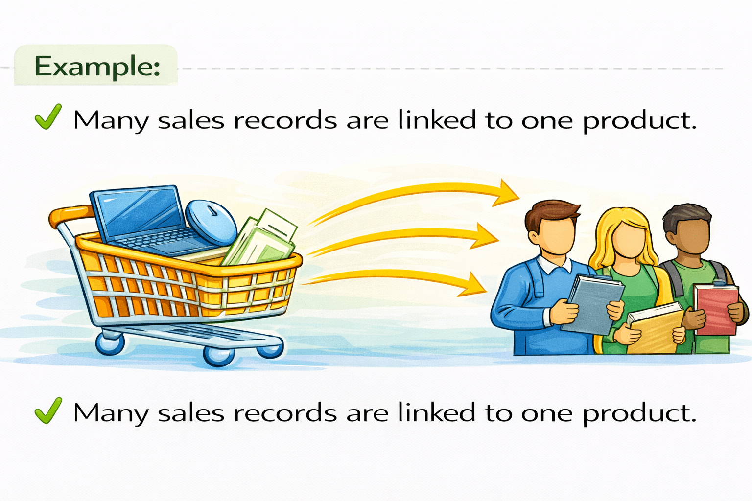 One customer can make multiple sales, and each sale is linked back to that customer using a foreign key.