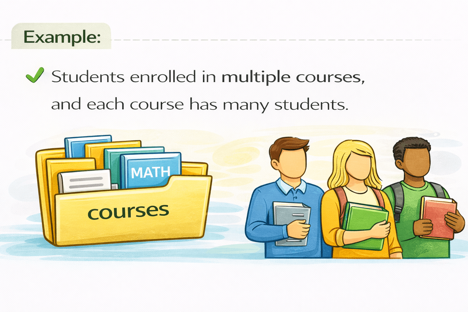 A many-to-many relationship means multiple records in one table relate to multiple records in another table.