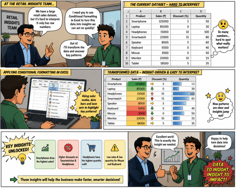 Your task is to use Conditional Formatting in Excel to highlight key patterns and extract meaningful business insights from the dataset.
