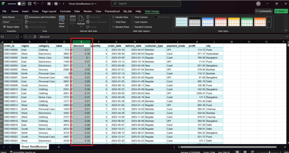 Open the Excel dataset and select the entire Discount column that contains the discount values.