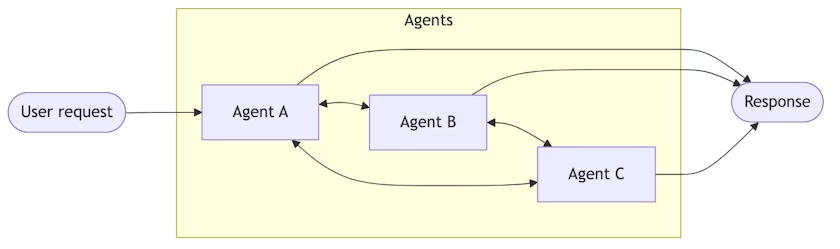 Agents transfer control to each other via tool calls. Each agent can hand off to others or respond directly.