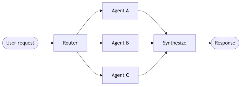 A routing step classifies input and directs it to specialized agents. Results are synthesized.