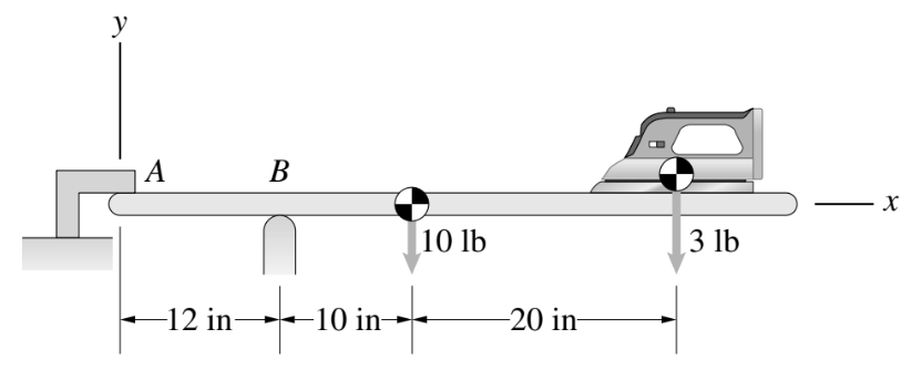 La tabla de planchar tiene soportes en A y B que pueden ser modelados como soportes de rodillos.