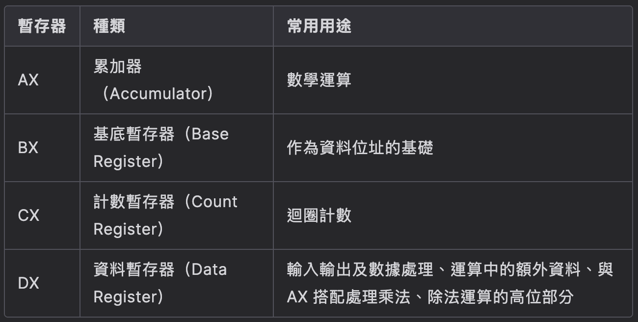 ; dx:ax = ax*cx(結果可能超過 ax 位數 16 bits,用 dx 接高位)