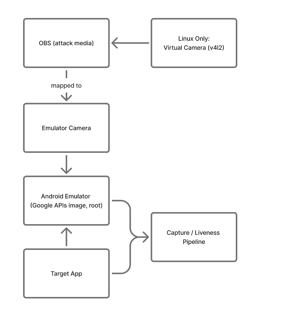 - Virtual camera (OBS → v4l2 / host webcam mapping) to feed crafted video.