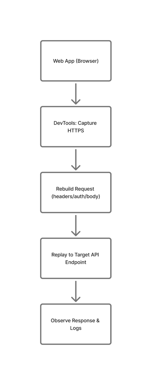 API Replay: capture HTTPS in browser dev tools → recreate request structure → replay to endpoint (respect auth/headers and crypto where possible).