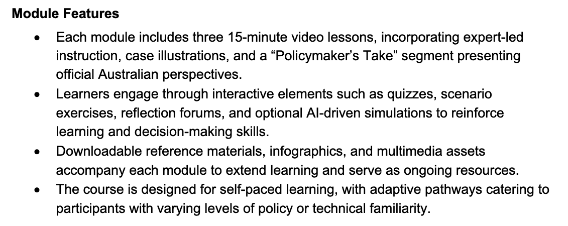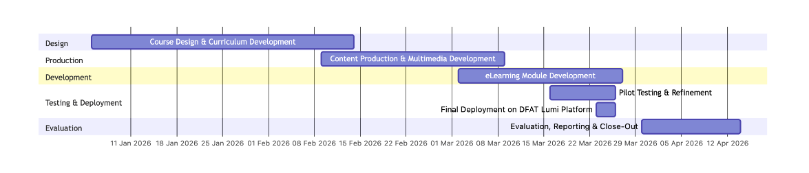 - Design: Translate objectives into clear learning outcomes, assessments, and storyboards. Define user experience flows, visual style, and tone to reflect DFAT’s branding and communication standards.