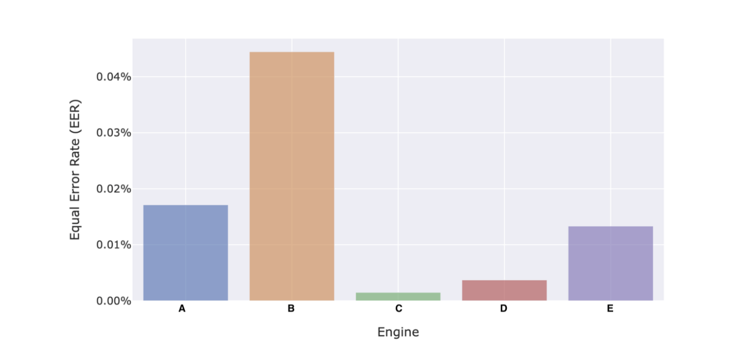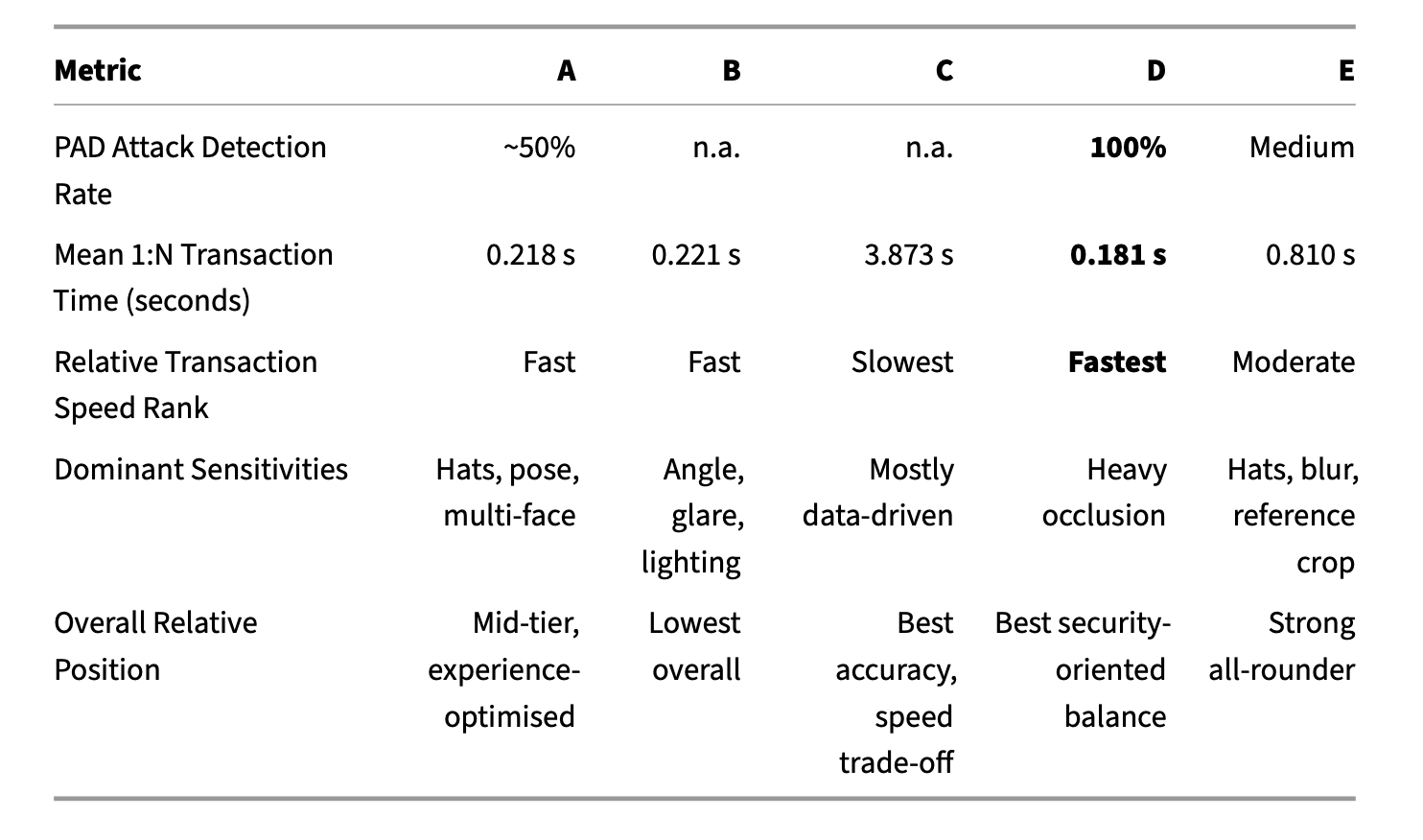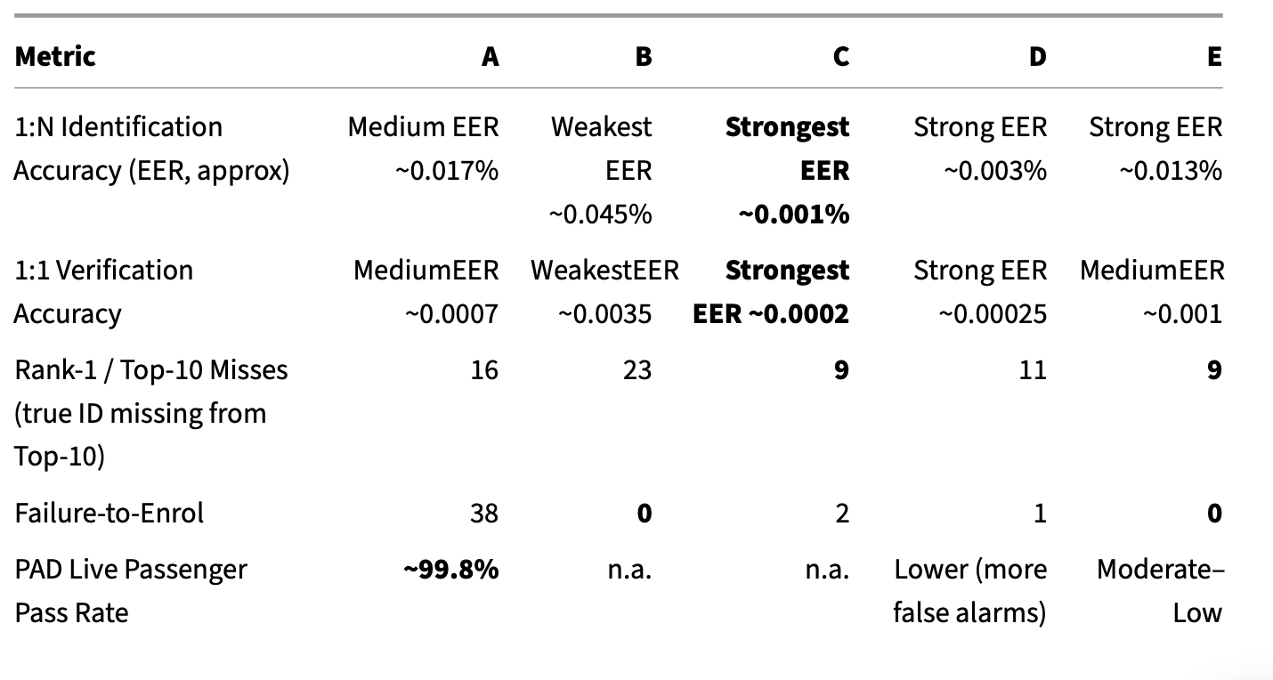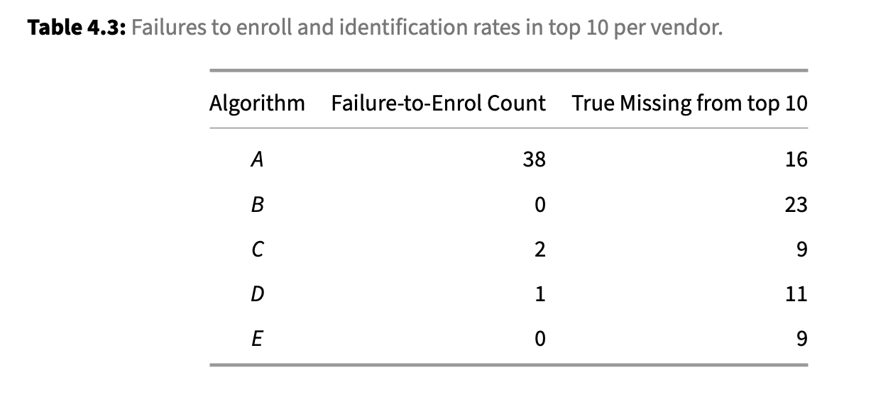 - Each algorithms generated approximately 142k records, corresponding to 7.1k transactions compared against 7.7k enrolled templates to form the candidate