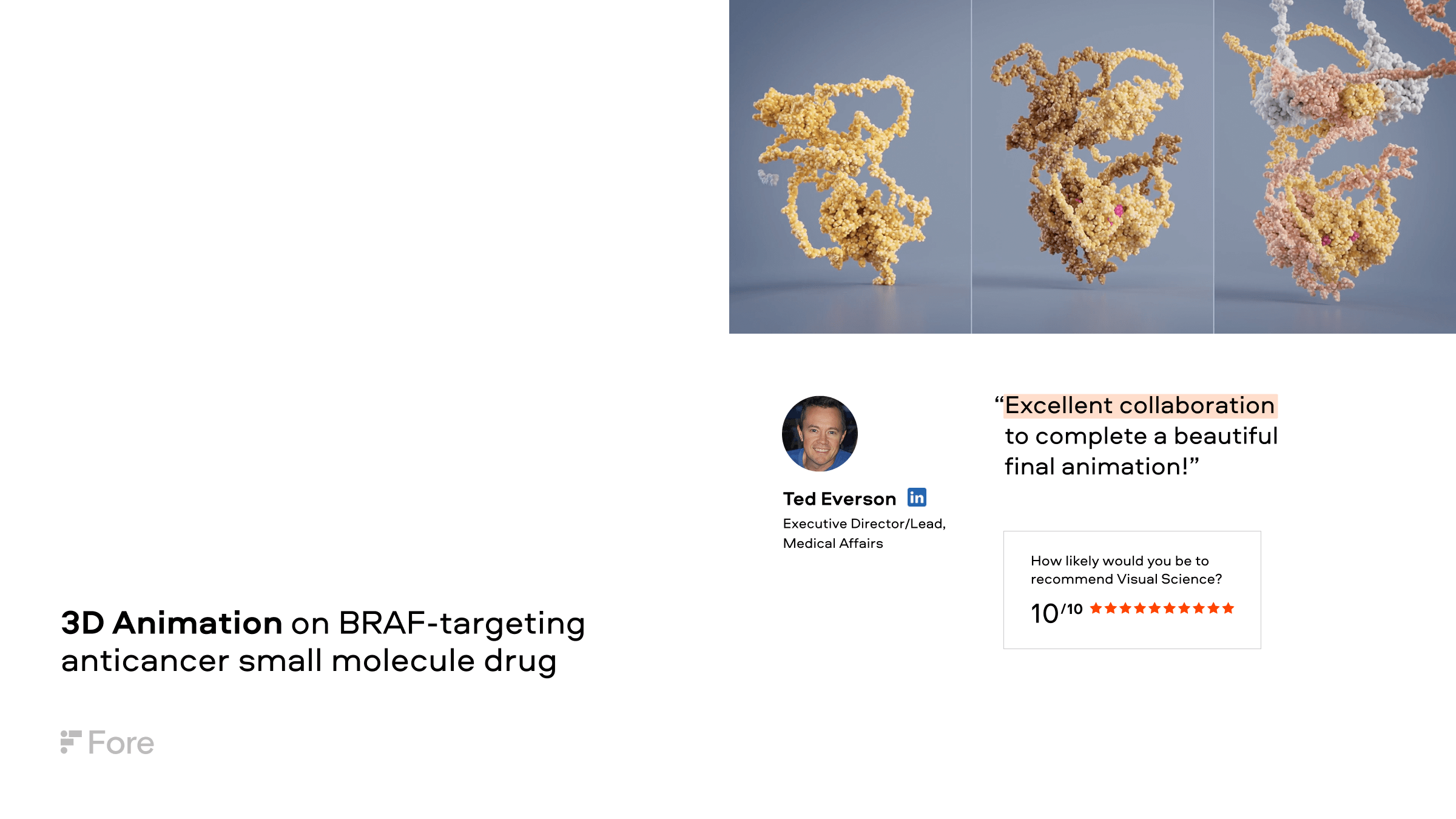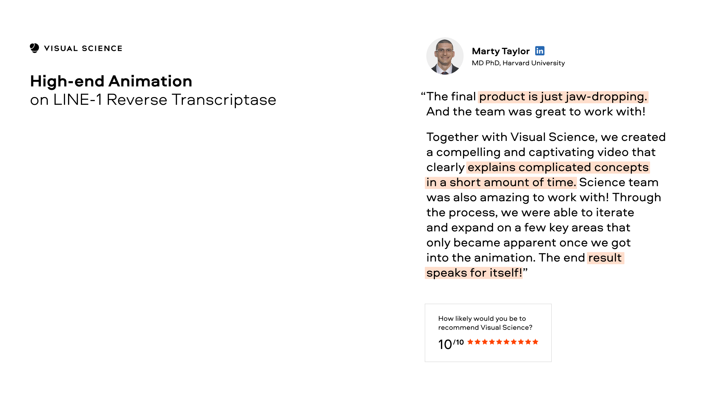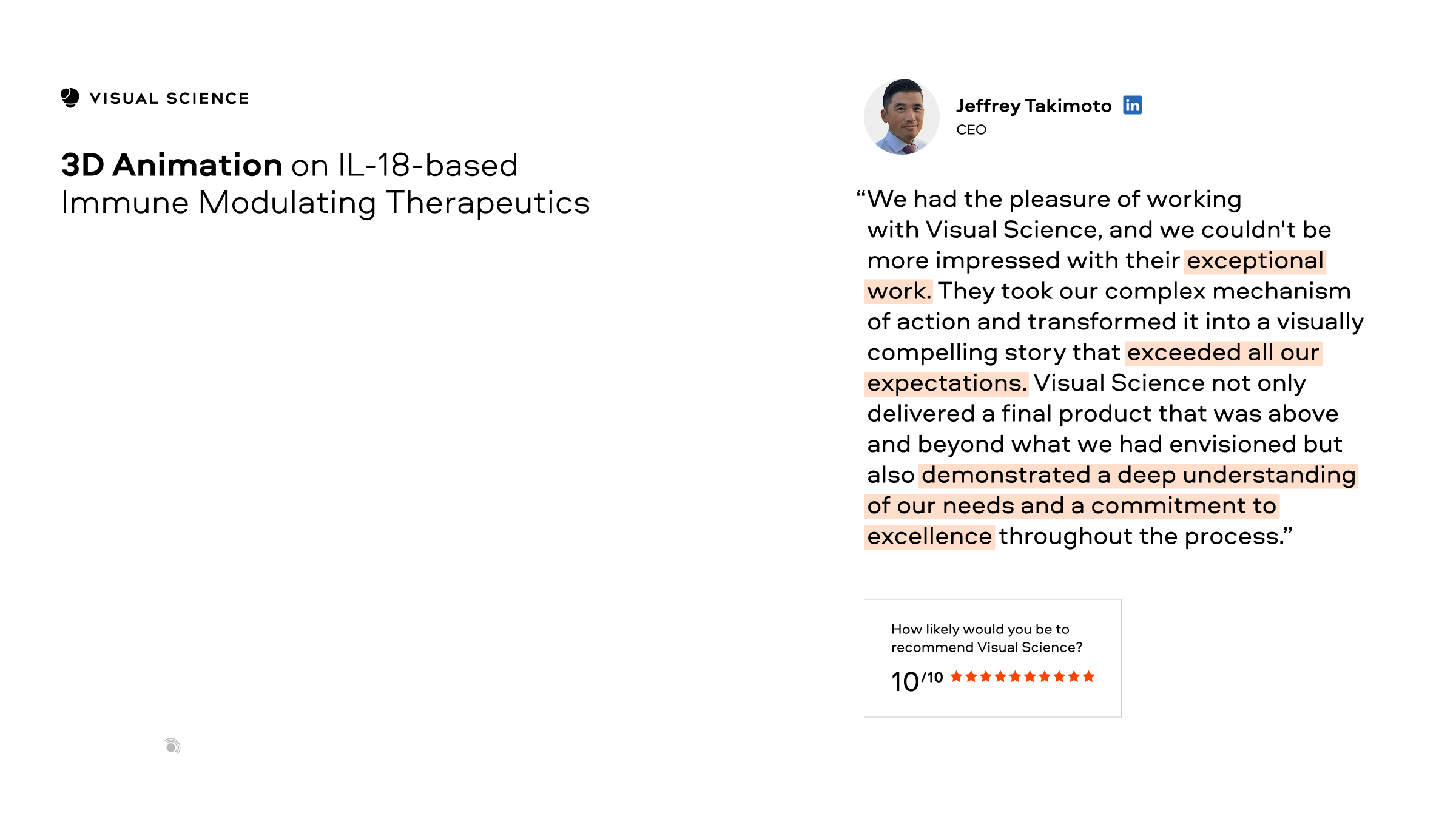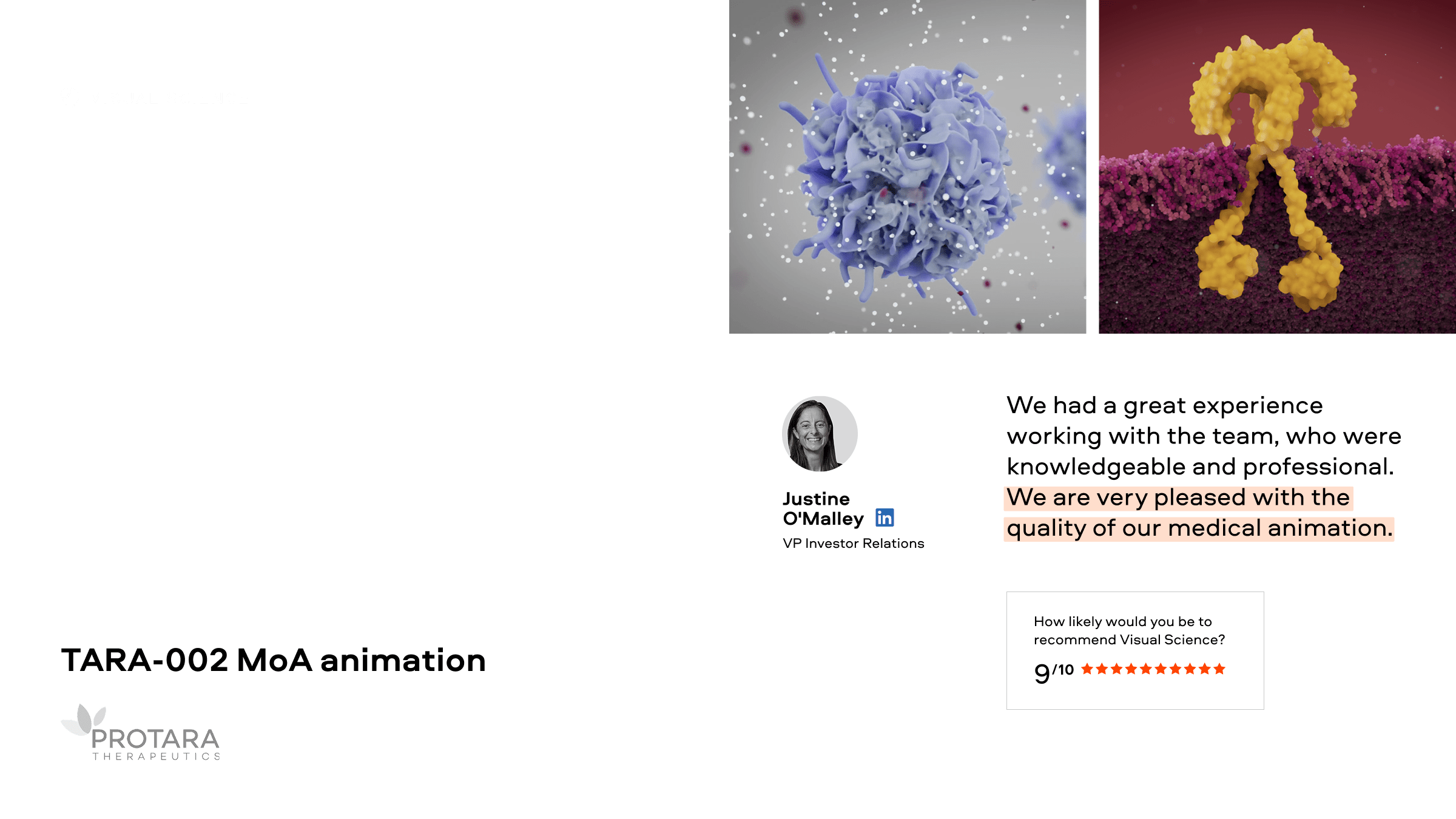 Visual Science is an award-winning biomedical visualization and animation company which brings scientists, software engineers, designers and computer graphics specialists under one roof to produce visual content and graphics that are eye-catching and scientifically rigorous. Since 2007, we’ve helped both Fortune 500 and small companies around the world share cutting-edge ideas using clear, compelling graphics. Our graphics have been featured by leading media outlets and viewed hundreds of millions of times.